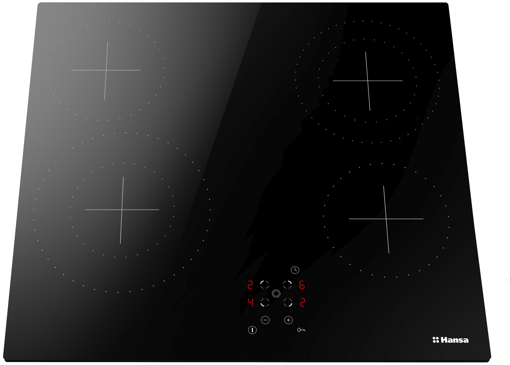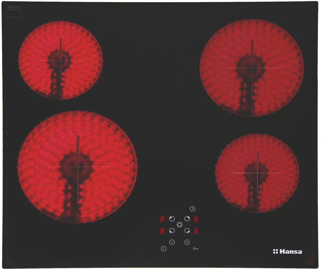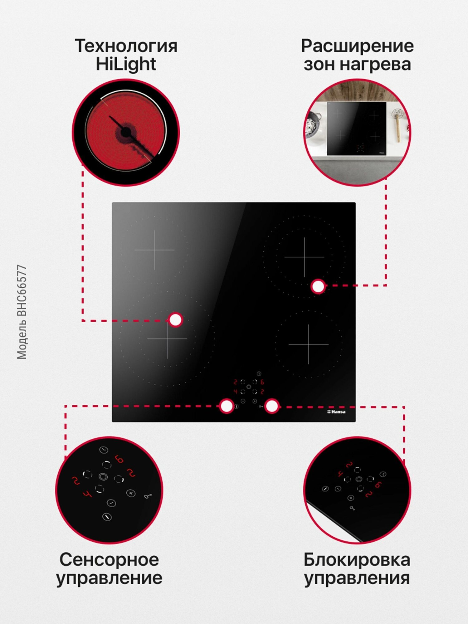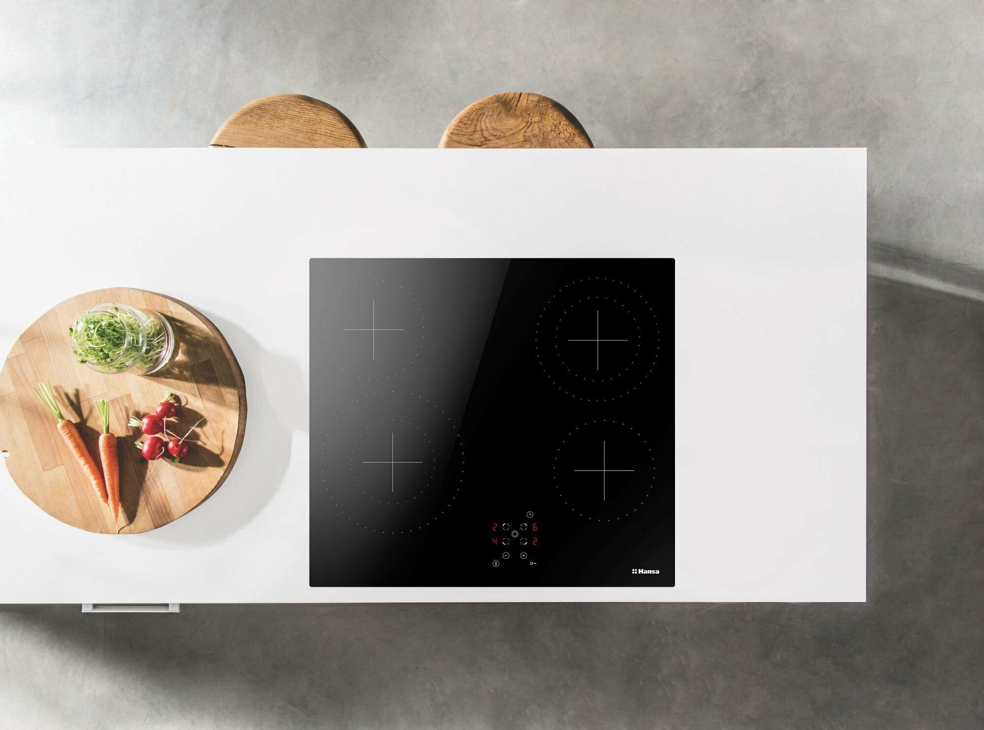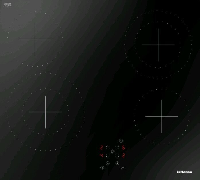 Безопасность - защитное отключение конфорок, кнопка блокировки панели, индикатор остаточного тепла;
