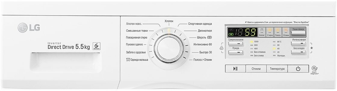 Габариты (ШxГxВ) 60x44x85 см * Загрузка 5,5 к * Макс. отжим 1000 (об/мин) * Кол-во программ 13 * Инверторный мотор с прямым приводом * Мобильная диагностика Smart Diagnosis * 6 движений заботы * Класс энергоэффективности А * Класс стирки А * Класс отжима В * Функция очистки барабана * Цвет дверцы/корпус Белый/Белый